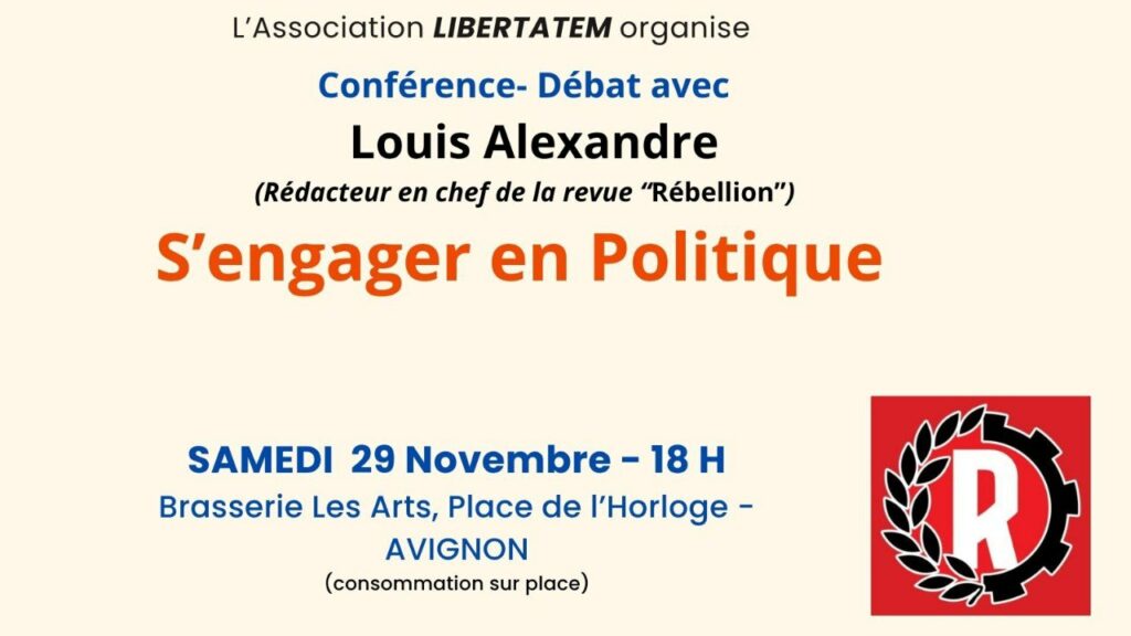 Conférence de Louis Alexandre à Avignon le samedi 29 novembre : « S’engager en politique » 13 novembre 2025 La revue Rébellion, Non classé Partager : Cliquer pour partager sur X(ouvre dans une nouvelle fenêtre) X Cliquez pour partager sur Facebook(ouvre dans une nouvelle fenêtre) Facebook Cliquer pour envoyer un lien par e-mail à un ami(ouvre dans une nouvelle fenêtre) E-mail Cliquer pour imprimer(ouvre dans une nouvelle fenêtre) Imprimer Similaire Laisser un commentaire